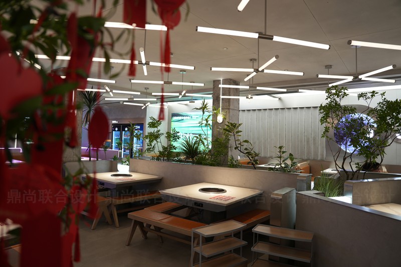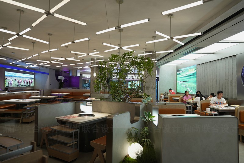 在都市的喧嚣里,如何为食客打造一个既能尽情沸腾,又能彻底放松的“精神自留地”?我们拒绝千篇一律的“网红风”,用材质讲述一个关于“碰撞”的故事。大面积的水泥灰奠定冷静、高级的基调,这是空间的“硬核骨架”;温暖的木质卡座与柔和布艺则作为“温暖血肉”,与水泥的“冷”形成对话,平衡了工业风的距离感,赋予空间人性的温度。光影是空间的灵魂:白天的斑驳光影与夜晚的暖黄霓虹,共同营造出从惬意到微醺的丰富氛围,极大提升了用餐的仪式感与沉浸感。