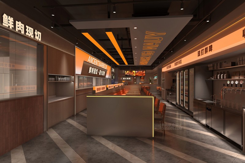 临街面打造的L型现切明档构成空间视觉焦点:通透的展示空间使顾客清晰看到食材处理全过程,强化“鲜肉现切”的品牌标签,消除消费者对街边烧烤的卫生疑虑。明档与收银台串联布局,既能吸引路人驻足,又能提升点餐效率,实现“展示+引流+体验”三效合一。